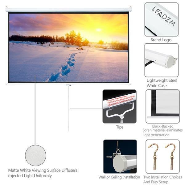 84" 16:9 Manual Projector Screen, can offer you a perfect visual enjoyment with optimal image and color reproduction. It is ideal for home theater movies, classroom training, conference room presentations, public display, etc. High quality matte white surface with 16:9 aspect ratio. It features high quality matte white viewing surface, which diffuses projected light evenly. Pull-down lock technology allows you to easily adjust the screen height and the aspect ratio. End cap bracket allows for wall or ceiling mount installation. Click and order one!